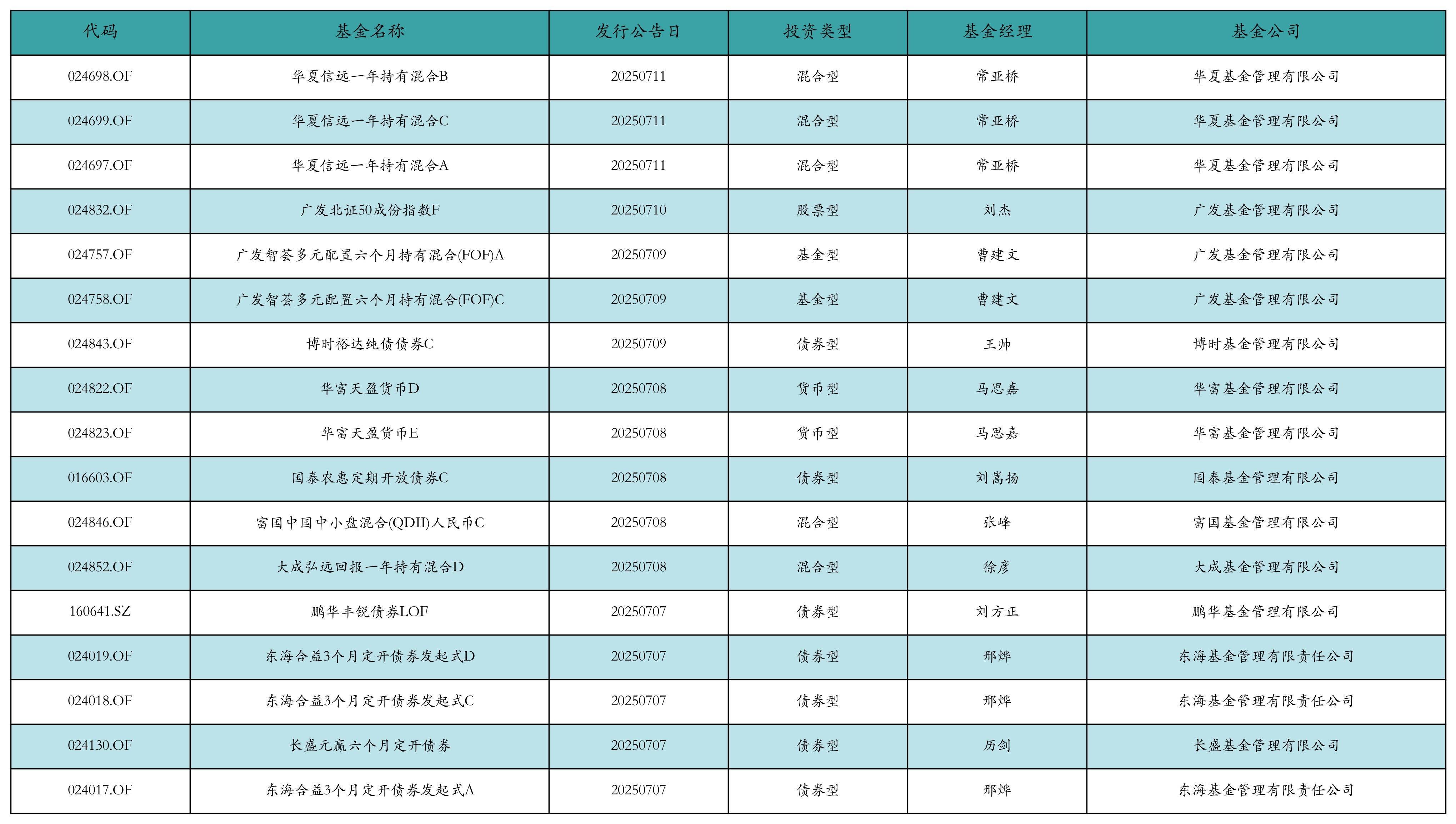 上周有17只新基金发行,分别为:华夏信远一年持有混合B、华夏信远一年持有混合C、华夏信远一年持有混合A、广发北证50成份指数F、广发智荟多元配置六个月持有混合(FOF)A、广发智荟多元配置六个月持有混合(FOF)C、博时裕达纯债债券C、华富天盈货币D、华富天盈货币E、国泰农惠定期开放债券C、富国中国中小盘混合(QDII)人民币C、大成弘远回报一年持有混合D、鹏华丰锐债券LOF、东海合益3个月定开债券发起式D、东海合益3个月定开债券发起式C、长盛元赢六个月定开债券、东海合益3个月定开债券发起式A,详情见下表: