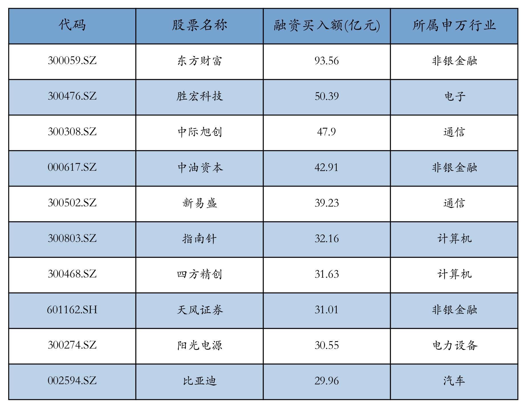 上周两市共有3413只个股有融资资金买入,共有74只个股买入金额超10亿元,其中东方财富、胜宏科技、中际旭创排名前三,买入金额分别93.56亿元、50.39亿元、47.9亿元。融资买入额前10个股详情见下表: