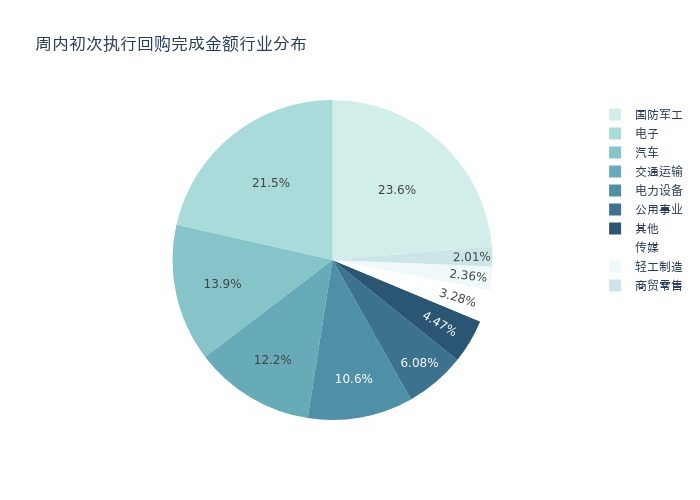 按照初次执行金额所在不同行业分布,金额最高的3个行业分别为:国防军工、电子、汽车,详情见下图: